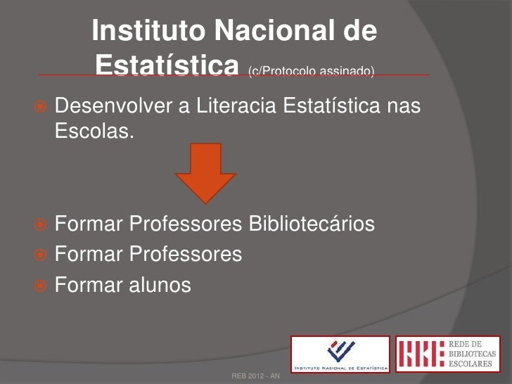 2. 2. Instituto Nacional de Estatística (c/Protocolo assinado) Desenvolver a Literacia Estatística nas Escolas. Formar Professores Bibliotecários Formar Professores Formar alunos REB 2012 - AN
