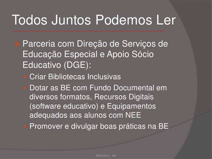 20. 20. Todos Juntos Podemos Ler Parceria com Direção de Serviços de Educação Especial e Apoio Sócio Educativo (DGE):  Criar Bibliotecas Inclusivas  Dotar as BE com Fundo Documental em diversos formatos, Recursos Digitais (software educativo) e Equipamentos adequados aos alunos com NEE  Promover e divulgar boas práticas na BE REB 2012 - AN