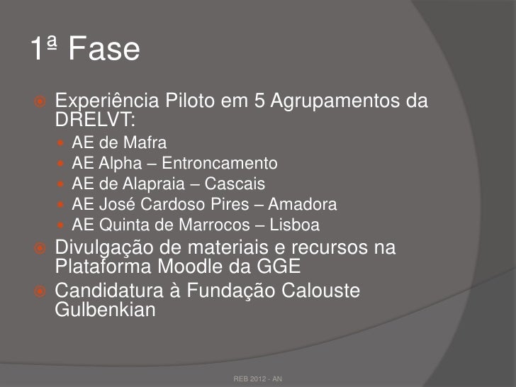 21. 21. 1ª Fase Experiência Piloto em 5 Agrupamentos da DRELVT:  AE de Mafra  AE Alpha – Entroncamento  AE de Alapraia – Cascais  AE José Cardoso Pires – Amadora  AE Quinta de Marrocos – Lisboa Divulgação de materiais e recursos na Plataforma Moodle da GGE Candidatura à Fundação Calouste Gulbenkian REB 2012 - AN