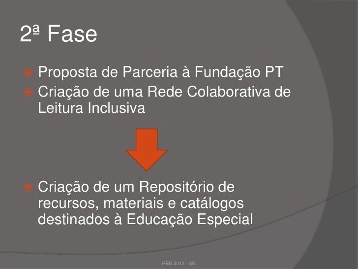 22. 22. 2ª Fase Proposta de Parceria à Fundação PT Criação de uma Rede Colaborativa de Leitura Inclusiva Criação de um Repositório de recursos, materiais e catálogos destinados à Educação Especial REB 2012 - AN