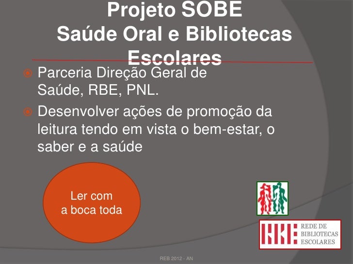 23. 23. Projeto SOBE Saúde Oral e Bibliotecas Escolares Parceria Direção Geral de Saúde, RBE, PNL. Desenvolver ações de promoção da leitura tendo em vista o bem-estar, o saber e a saúde Ler com a boca toda REB 2012 - AN