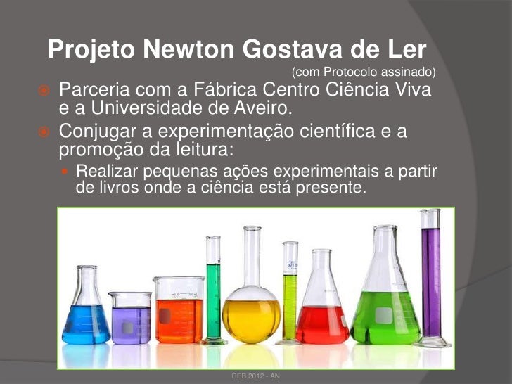 24. 24. Projeto Newton Gostava de Ler (com Protocolo assinado) Parceria com a Fábrica Centro Ciência Viva e a Universidade de Aveiro. Conjugar a experimentação científica e a promoção da leitura:  Realizar pequenas ações experimentais a partir de livros onde a ciência está presente. REB 2012 - AN