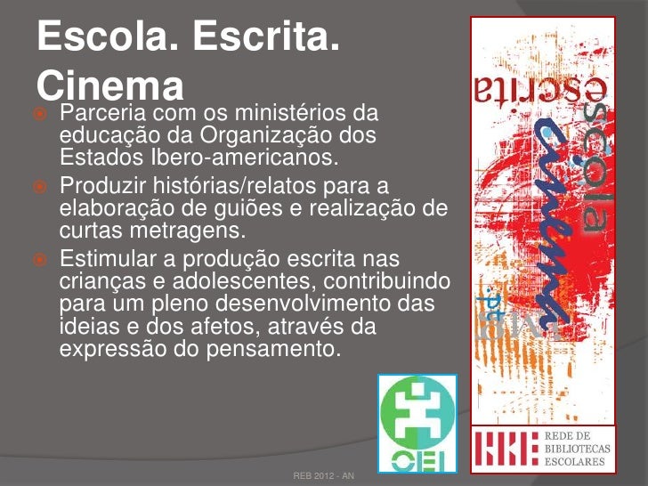 26. 26. Escola. Escrita.Cinema os ministérios da Parceria com educação da Organização dos Estados Ibero-americanos. Produzir histórias/relatos para a elaboração de guiões e realização de curtas metragens. Estimular a produção escrita nas crianças e adolescentes, contribuindo para um pleno desenvolvimento das ideias e dos afetos, através da expressão do pensamento. REB 2012 - AN