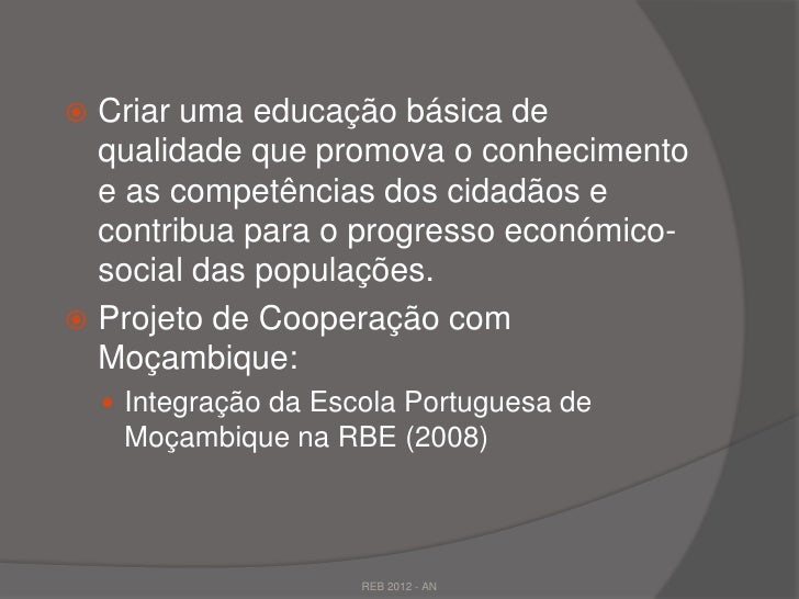 28. 28.  Criar uma educação básica de qualidade que promova o conhecimento e as competências dos cidadãos e contribua para o progresso económico- social das populações. Projeto de Cooperação com Moçambique:  Integração da Escola Portuguesa de Moçambique na RBE (2008) REB 2012 - AN