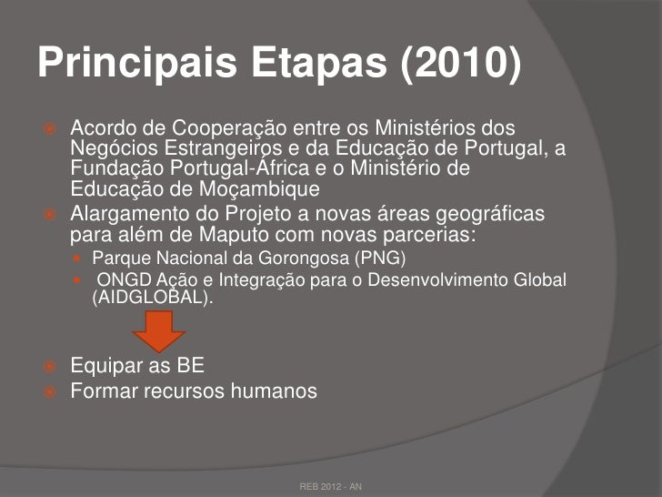 29. 29. Principais Etapas (2010) Acordo de Cooperação entre os Ministérios dos Negócios Estrangeiros e da Educação de Portugal, a Fundação Portugal-África e o Ministério de Educação de Moçambique Alargamento do Projeto a novas áreas geográficas para além de Maputo com novas parcerias:  Parque Nacional da Gorongosa (PNG)  ONGD Ação e Integração para o Desenvolvimento Global (AIDGLOBAL). Equipar as BE Formar recursos humanos REB 2012 - AN