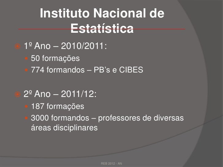 3. 3. Instituto Nacional de Estatística 1º Ano – 2010/2011:  50 formações  774 formandos – PB’s e CIBES 2º Ano – 2011/12:  187 formações  3000 formandos – professores de diversas áreas disciplinares REB 2012 - AN