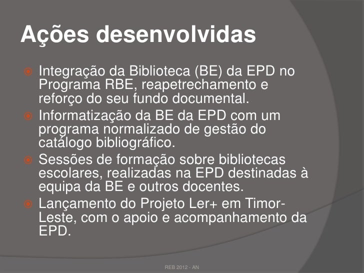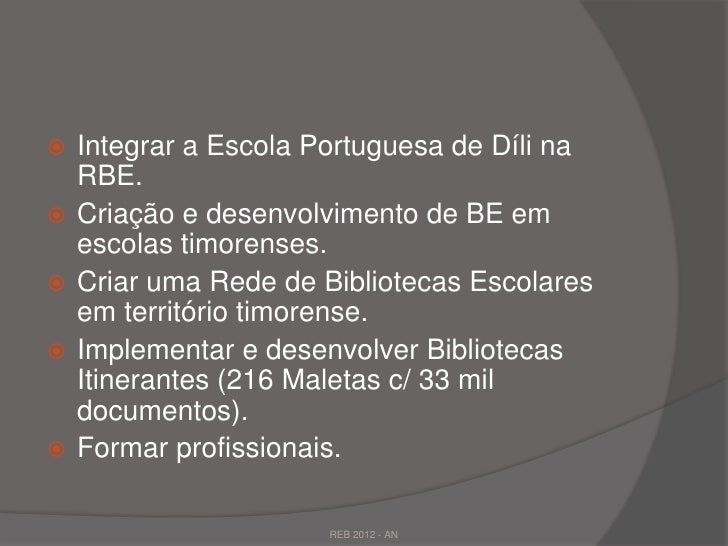 31. 31.  Integrar a Escola Portuguesa de Díli na RBE. Criação e desenvolvimento de BE em escolas timorenses. Criar uma Rede de Bibliotecas Escolares em território timorense. Implementar e desenvolver Bibliotecas Itinerantes (216 Maletas c/ 33 mil documentos). Formar profissionais. REB 2012 - AN