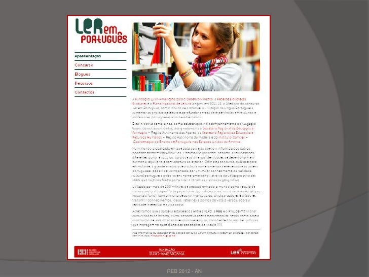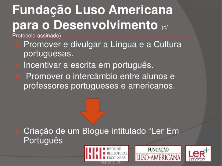 4. 4. Fundação Luso Americanapara o Desenvolvimento (c/Protocolo assinado) Promover e divulgar a Língua e a Cultura portuguesas. Incentivar a escrita em português. Promover o intercâmbio entre alunos e professores portugueses e americanos. Criação de um Blogue intitulado “Ler Em Português REB 2012 - AN