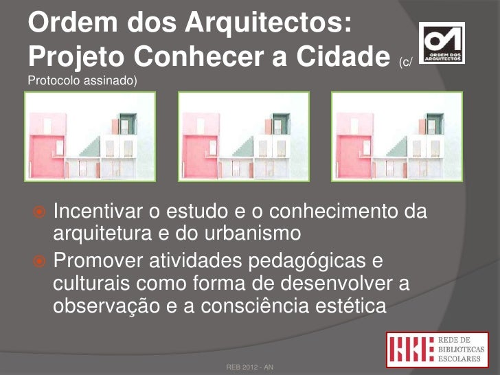 6. 6. Ordem dos Arquitectos:Projeto Conhecer a Cidade (c/Protocolo assinado) Incentivar o estudo e o conhecimento da arquitetura e do urbanismo Promover atividades pedagógicas e culturais como forma de desenvolver a observação e a consciência estética REB 2012 - AN