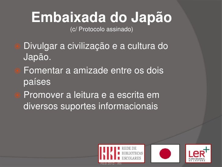 8. 8. Embaixada do Japão (c/ Protocolo assinado) Divulgar a civilização e a cultura do Japão. Fomentar a amizade entre os dois países Promover a leitura e a escrita em diversos suportes informacionais REB 2012 - AN