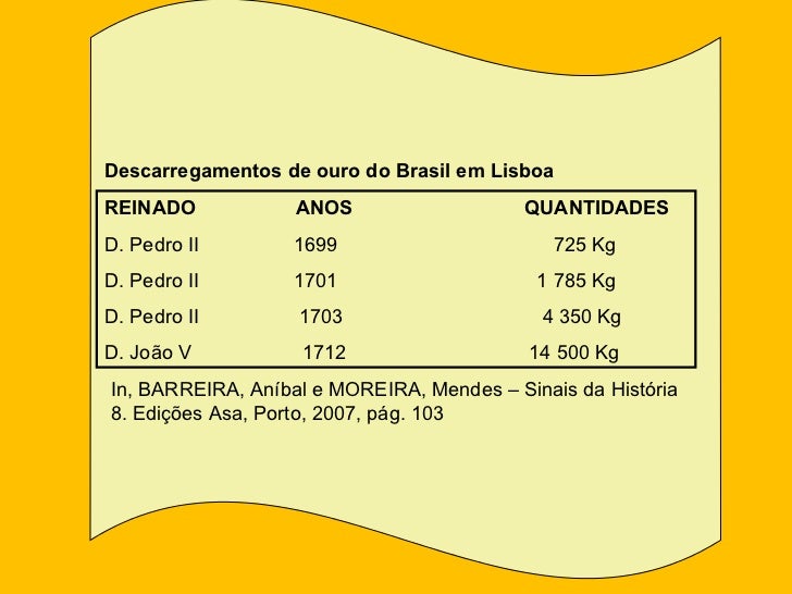 11. 17. REINADO ANOS QUANTIDADES D. Pedro II 1699 725 Kg D. Pedro II 1701 1 785 Kg D. Pedro II 1703 4 350 Kg D. João V 1712 14 500 Kg Descarregamentos de ouro do Brasil em Lisboa In, BARREIRA, Aníbal e MOREIRA, Mendes – Sinais da História 8. Edições Asa, Porto, 2007, pág. 103