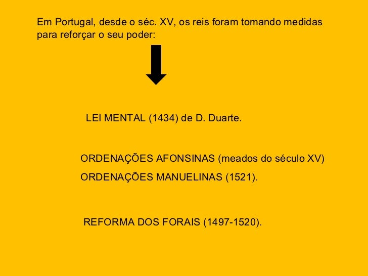 12. 18. Em Portugal, desde o séc. XV, os reis foram tomando medidas para reforçar o seu poder: LEI MENTAL (1434) de D. Duarte. ORDENAÇÕES AFONSINAS (meados do século XV) ORDENAÇÕES MANUELINAS (1521). REFORMA DOS FORAIS (1497-1520).