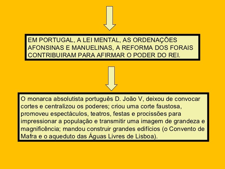 17. 23. EM PORTUGAL, A LEI MENTAL, AS ORDENAÇÕES AFONSINAS E MANUELINAS, A REFORMA DOS FORAIS CONTRIBUIRAM PARA AFIRMAR O PODER DO REI. O monarca absolutista português D. João V, deixou de convocar cortes e centralizou os poderes; criou uma corte faustosa, promoveu espectáculos, teatros, festas e procissões para impressionar a população e transmitir uma imagem de grandeza e magnificência; mandou construir grandes edifícios (o Convento de Mafra e o aqueduto das Águas Livres de Lisboa).