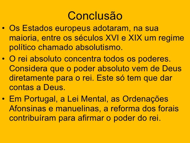18. 24. Conclusão <ul><li>Os Estados europeus adotaram, na sua maioria, entre os séculos XVI e XIX um regime político chamado absolutismo. </li></ul><ul><li>O rei absoluto concentra todos os poderes. Considera que o poder absoluto vem de Deus diretamente para o rei. Este só tem que dar contas a Deus. </li></ul><ul><li>Em Portugal, a Lei Mental, as Ordenações Afonsinas e manuelinas, a reforma dos forais contribuíram para afirmar o poder do rei. </li></ul>