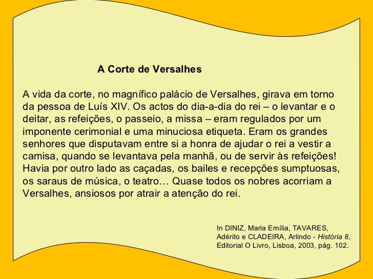 5. 5. A Corte de Versalhes A vida da corte, no magnífico palácio de Versalhes, girava em torno da pessoa de Luís XIV. Os actos do dia-a-dia do rei – o levantar e o deitar, as refeições, o passeio, a missa – eram regulados por um imponente cerimonial e uma minuciosa etiqueta. Eram os grandes senhores que disputavam entre si a honra de ajudar o rei a vestir a camisa, quando se levantava pela manhã, ou de servir às refeições! Havia por outro lado as caçadas, os bailes e recepções sumptuosas, os saraus de música, o teatro… Quase todos os nobres acorriam a Versalhes, ansiosos por atrair a atenção do rei. In DINIZ, Maria Emília, TAVARES, Adérito e CLADEIRA, Arlindo - História 8 , Editorial O Livro, Lisboa, 2003, pág. 102.