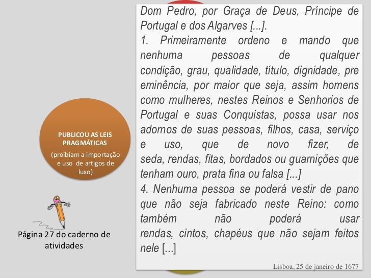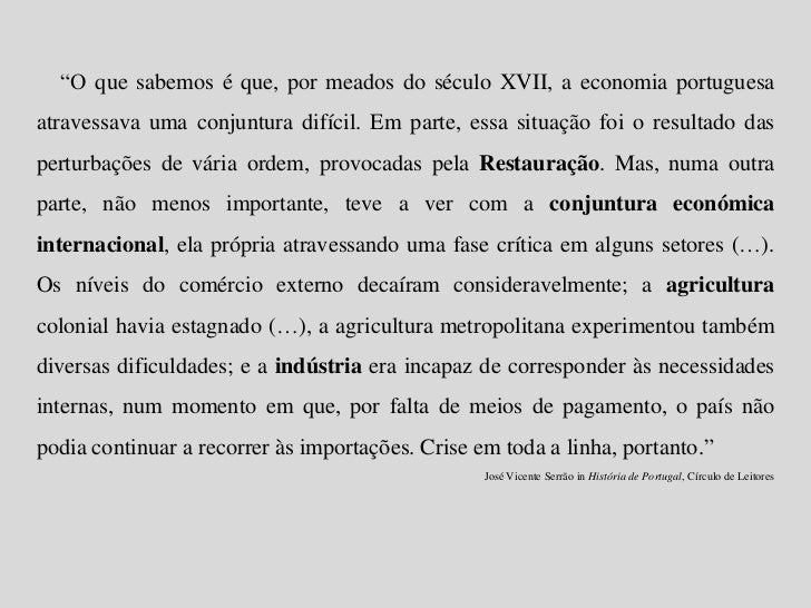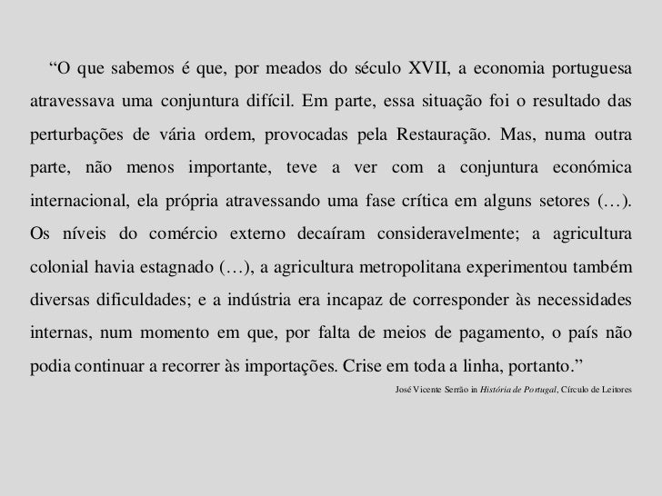 10. 10. “O que sabemos é que, por meados do século XVII, a economia portuguesaatravessava uma conjuntura difícil. Em parte, essa situação foi o resultado dasperturbações de vária ordem, provocadas pela Restauração. Mas, numa outraparte, não menos importante, teve a ver com a conjuntura económicainternacional, ela própria atravessando uma fase crítica em alguns setores (…).Os níveis do comércio externo decaíram consideravelmente; a agriculturacolonial havia estagnado (…), a agricultura metropolitana experimentou tambémdiversas dificuldades; e a indústria era incapaz de corresponder às necessidadesinternas, num momento em que, por falta de meios de pagamento, o país nãopodia continuar a recorrer às importações. Crise em toda a linha, portanto.” José Vicente Serrão in História de Portugal, Círculo de Leitores