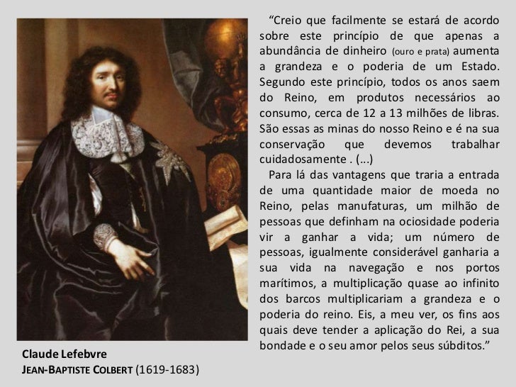 13. 13. “Creio que facilmente se estará de acordo sobre este princípio de que apenas a abundância de dinheiro (ouro e prata) aumenta a grandeza e o poderia de um Estado. Segundo este princípio, todos os anos saem do Reino, em produtos necessários ao consumo, cerca de 12 a 13 milhões de libras. São essas as minas do nosso Reino e é na sua conservação que devemos trabalhar cuidadosamente . (...) Para lá das vantagens que traria a entrada de uma quantidade maior de moeda no Reino, pelas manufaturas, um milhão de pessoas que definham na ociosidade poderia vir a ganhar a vida; um número de pessoas, igualmente considerável ganharia a sua vida na navegação e nos portos marítimos, a multiplicação quase ao infinito dos barcos multiplicariam a grandeza e o poderia do reino. Eis, a meu ver, os fins aos quais deve tender a aplicação do Rei, a sua bondade e o seu amor pelos seus súbditos.”Claude LefebvreJEAN-BAPTISTE COLBERT (1619-1683)
