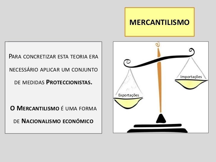 14. 14. MERCANTILISMOPARA CONCRETIZAR ESTA TEORIA ERANECESSÁRIO APLICAR UM CONJUNTO Exportações Importações DE MEDIDAS PROTECCIONISTAS. Importações ExportaçõesO MERCANTILISMO É UMA FORMA DE NACIONALISMO ECONÓMICO