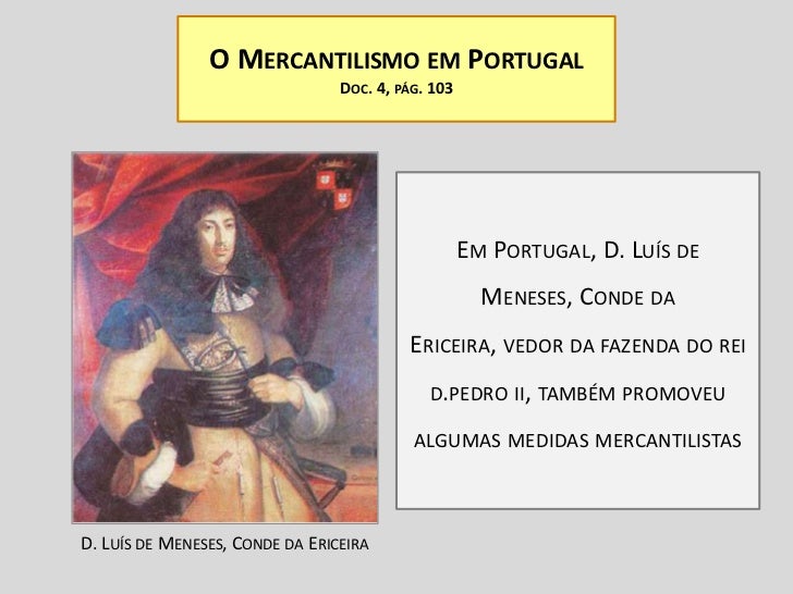 16. 16. O MERCANTILISMO EM PORTUGAL DOC. 4, PÁG. 103 EM PORTUGAL, D. LUÍS DE MENESES, CONDE DA ERICEIRA, VEDOR DA FAZENDA DO REI D.PEDRO II, TAMBÉM PROMOVEU ALGUMAS MEDIDAS MERCANTILISTASD. LUÍS DE MENESES, CONDE DA ERICEIRA