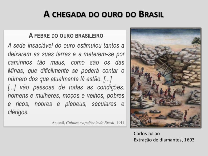 20. 20. A CHEGADA DO OURO DO BRASIL A FEBRE DO OURO ouro do Brasil Descarregamentos de BRASILEIROA sede insaciável do(kg) estimulou tantos ouro adeixarem as suas terras e a meterem-se por14000caminhos tão maus, como são os das12000Minas, que dificilmente se poderá contar o10000número dos que atualmente lá estão. [...] 8000[...] vão pessoas de todas as condições: 6000homens e mulheres, moços e velhos, pobres 4000e2000ricos, nobres e plebeus, seculares eclérigos. 0 1699 1701 1703 1712 Antonil, Cultura e opulência do Brasil, 1911 Carlos Julião Extração de diamantes, 1693