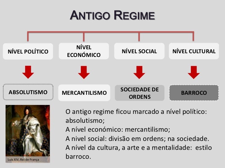 3. 3. ANTIGO REGIME NÍVELNÍVEL POLÍTICO NÍVEL SOCIAL NÍVEL CULTURAL ECONÓMICOABSOLUTISMO SOCIEDADE DE MERCANTILISMO BARROCO ORDENS O antigo regime ficou marcado a nível político: absolutismo; A nível económico: mercantilismo; A nivel social: divisão em ordens; na sociedade. A nível da cultura, a arte e a mentalidade: estiloLuísJoão V, Rei de Portugal D. XIV, Rei de França barroco.