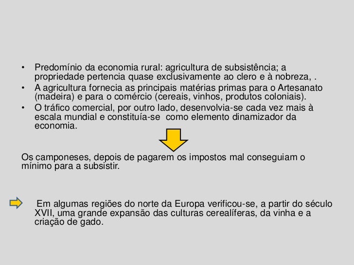 6. 6. • Predomínio da economia rural: agricultura de subsistência; a propriedade pertencia quase exclusivamente ao clero e à nobreza, .• A agricultura fornecia as principais matérias primas para o Artesanato (madeira) e para o comércio (cereais, vinhos, produtos coloniais).• O tráfico comercial, por outro lado, desenvolvia-se cada vez mais à escala mundial e constituía-se como elemento dinamizador da economia.Os camponeses, depois de pagarem os impostos mal conseguiam omínimo para a subsistir. Em algumas regiões do norte da Europa verificou-se, a partir do século XVII, uma grande expansão das culturas cerealíferas, da vinha e a criação de gado.