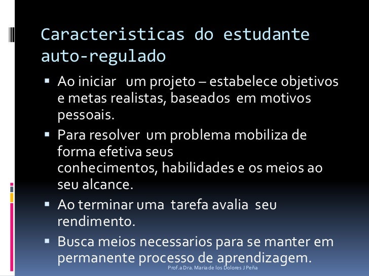 10. 10. A aprendizagemautoreguladafatoressencial<br />Umprocessoativo e construtivo<br />O estudanteestabeleceseus objetivos de aprendizagem .<br />Monitora, regula e controla:<br />Seuspensamentos<br />Suamotivação<br />Seucomportamento<br />Prof.a Dra. Maria de los Dolores J Peña<br />