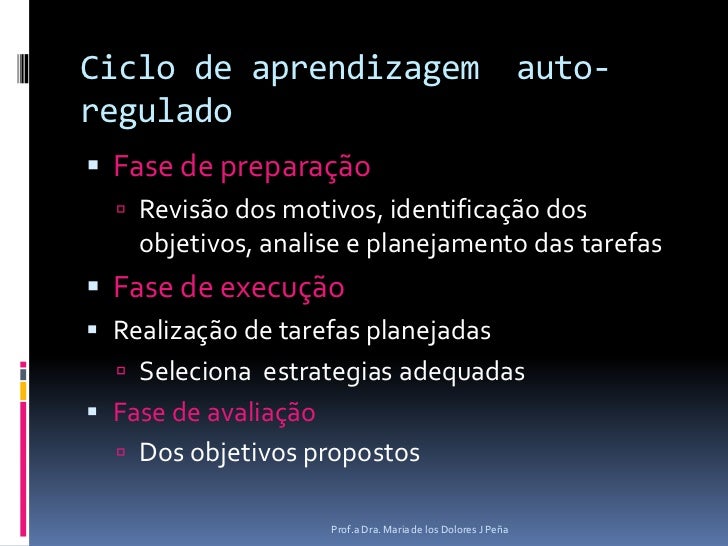 12. 12. Ciclo de aprendizagem auto-regulado<br />Fase de preparação<br />Revisão dos motivos, identificação dos objetivos, analise e planejamento das tarefas<br />Fase de execução<br />Realização de tarefasplanejadas<br />Seleciona estrategias adequadas<br />Fase de avaliação<br />Dos objetivos propostos<br />Prof.a Dra. Maria de los Dolores J Peña<br />