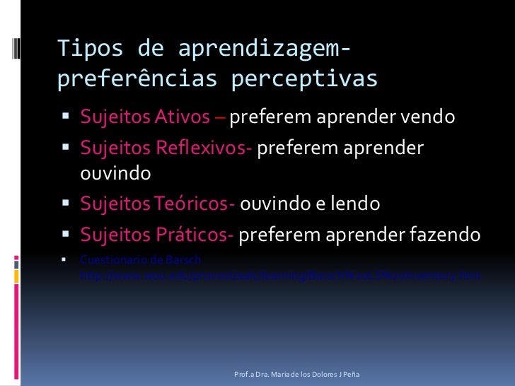 13. 13. Tipos de aprendizagem- preferências perceptivas <br />Sujeitos Ativos – preferem aprender vendo <br />Sujeitos Reflexivos-preferem aprender ouvindo<br />Sujeitos Teóricos- ouvindo e lendo<br />Sujeitos Práticos- preferem aprender fazendo<br />Cuestionario de Barsch http://www.wou.edu/provost/aalc/learning/Barsch%20LS%20Inventory.htm<br />Prof.a Dra. Maria de los Dolores J Peña<br />