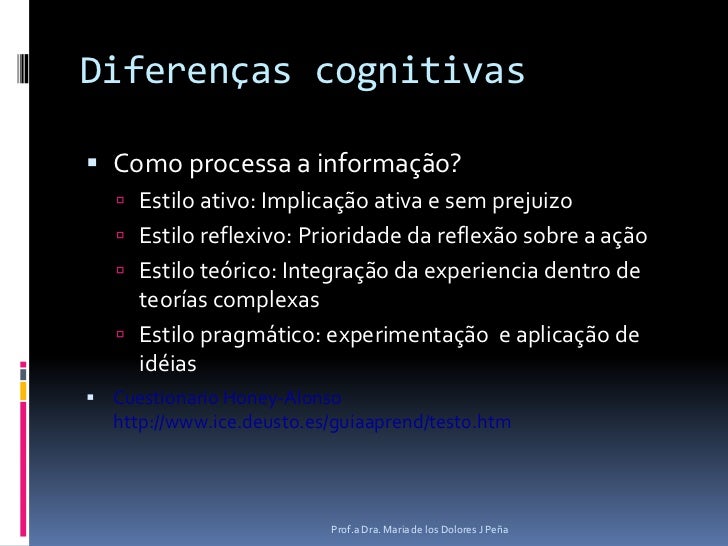 14. 14. Diferenças cognitivas<br />Como processa a informação?<br />Estilo ativo: Implicaçãoativa e semprejuizo<br />Estilo reflexivo: Prioridade da reflexão sobre a ação<br />Estilo teórico: Integração da experiencia dentro de teorías complexas<br />Estilo pragmático: experimentação e aplicação de idéias<br />Cuestionario Honey-Alonso http://www.ice.deusto.es/guiaaprend/test0.htm<br />Prof.a Dra. Maria de los Dolores J Peña<br />