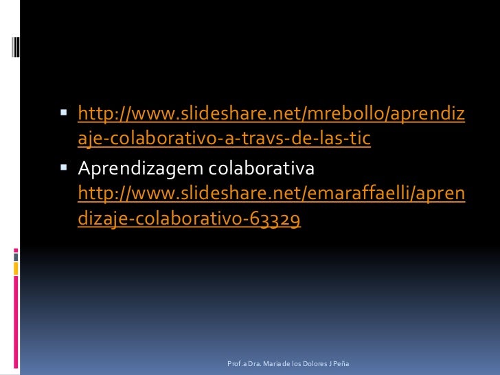 15. 15. http://www.slideshare.net/mrebollo/aprendizaje-colaborativo-a-travs-de-las-tic<br />Aprendizagem colaborativa http://www.slideshare.net/emaraffaelli/aprendizaje-colaborativo-63329<br />Prof.a Dra. Maria de los Dolores J Peña<br />