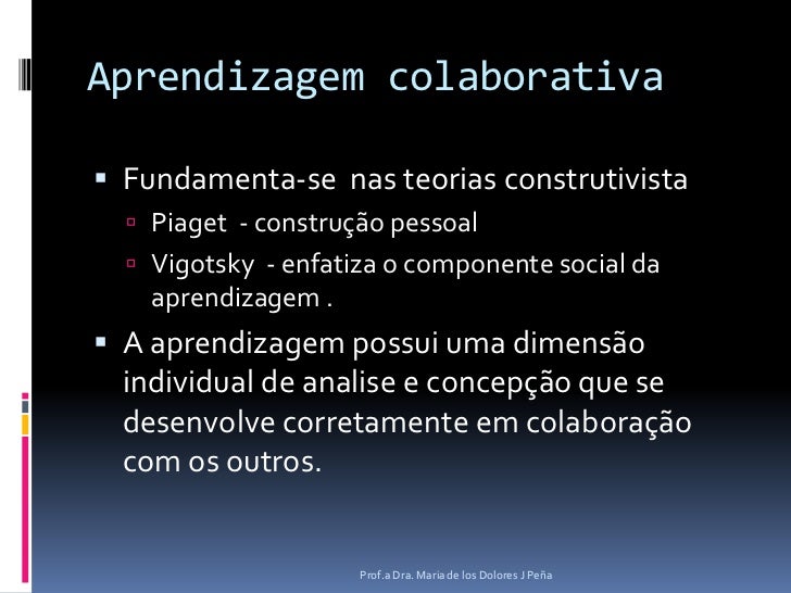 2. 2. Aprendizagem colaborativa<br />Fundamenta-se nas teorias construtivista <br />Piaget - construção pessoal<br />Vigotsky - enfatiza o componente social da aprendizagem .<br />A aprendizagem possui uma dimensão individual de analise e concepção que se desenvolve corretamente em colaboração com os outros. <br />Prof.a Dra. Maria de los Dolores J Peña<br />