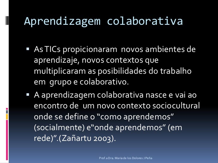 3. 3. Aprendizagem colaborativa<br />As TICspropicionaramnovos ambientes de aprendizaje, novos contextos que multiplicaram as posibilidades do trabalhoem grupo e colaborativo. <br />A aprendizagem colaborativa nasce e vaiaoencontro de umnovo contexto sociocultural onde se define o “como aprendemos” (socialmente) e“onde aprendemos” (em rede)”.(Zañartu 2003).<br />Prof.a Dra. Maria de los Dolores J Peña<br />