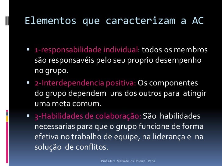 4. 4. Elementos que caracterizam a AC<br />1-responsabilidade individual: todos os membrossãoresponsavéis pelo seu proprio desempenho no grupo.<br />2-Interdependencia positiva: Os componentes do grupo dependemuns dos outros para atingir uma meta comum.<br />3-Habilidades de colaboração: São habilidades necessarias para que o grupo funcione de forma efetiva no trabalho de equipe, naliderança e nasolução de conflitos.<br />Prof.a Dra. Maria de los Dolores J Peña<br />