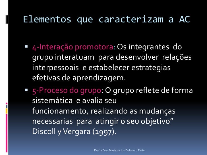 5. 5. Elementos que caracterizam a AC<br />4-Interação promotora: Os integrantes do grupo interatuam para desenvolver relaçõesinterpessoais e estabelecer estrategias efetivas de aprendizagem.<br />5-Proceso do grupo: O grupo reflete de forma sistemática e avaliaseufuncionamento, realizando as mudançasnecessarias para atingir o seu objetivo” Discoll y Vergara (1997).<br />Prof.a Dra. Maria de los Dolores J Peña<br />