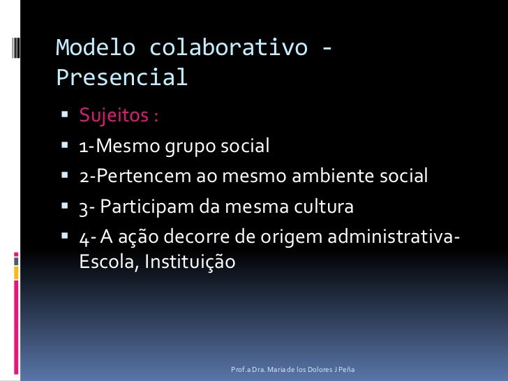 6. 6. Modelo colaborativo - Presencial<br />Sujeitos :<br />1-Mesmo grupo social<br />2-Pertencem ao mesmo ambiente social<br />3- Participam da mesma cultura<br />4- A ação decorre de origem administrativa- Escola, Instituição<br />Prof.a Dra. Maria de los Dolores J Peña<br />