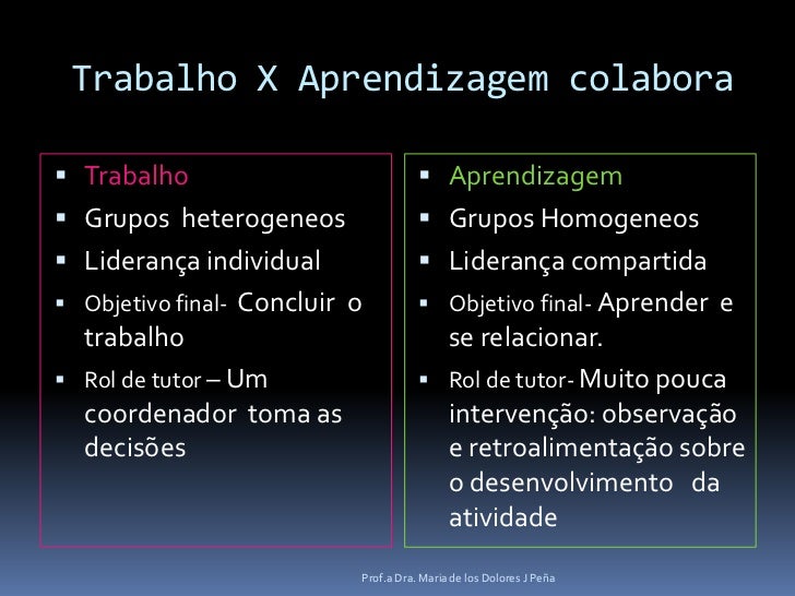 7. 7. Trabalho X Aprendizagem colabora <br />Trabalho<br />Grupos heterogeneos<br />Liderança individual<br />Objetivo final- Concluir o trabalho<br />Rol de tutor – Um coordenador toma as decisões<br />Aprendizagem<br />Grupos Homogeneos<br />Liderança compartida<br />Objetivo final- Aprender e se relacionar.<br />Rol de tutor- Muito pouca intervenção: observação e retroalimentação sobre o desenvolvimento da atividade <br />Prof.a Dra. Maria de los Dolores J Peña<br />