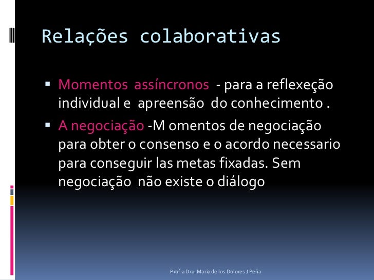 9. 9. Relações colaborativas<br />Momentos assíncronos- para a reflexeção individual e apreensão do conhecimento .<br />A negociação-M omentos de negociação para obter o consenso e o acordonecessario para conseguir las metas fixadas. Semnegociaçãonão existe o diálogo<br />Prof.a Dra. Maria de los Dolores J Peña<br />