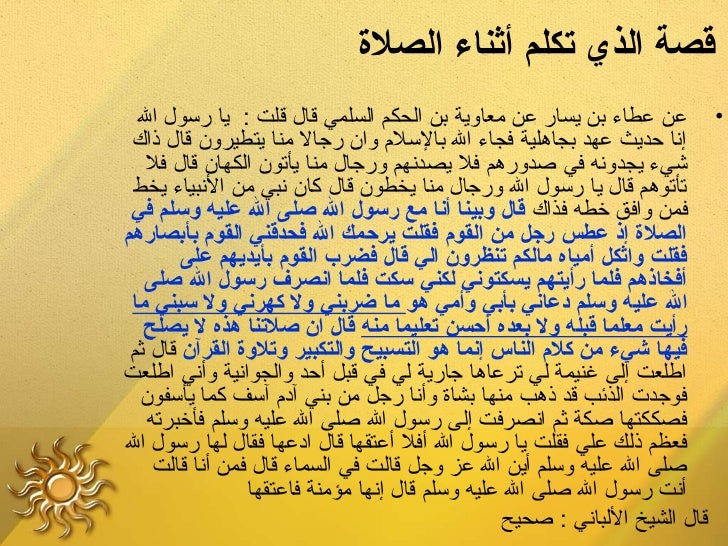 11. 11. ‫قصةلع الذيلع تكلملع أثناءلع الصلة‬ ‫• عن عطاء بن يسار عن معاوية بن الحكم السلمي قال قلت : يا رسول ال‬ ‫إنا حديث عهد بجاهلية فجاء ال بالسل م وا ن رجال منا يتطيرو ن قال ذاك‬ ‫شيء يجدونه في صدورهم فل يصدنهم ورجال منا يأتو ن الكها ن قال فل‬ ‫تأتوهم قال يا رسول ال ورجال منا يخطو ن قال كا ن نبي من النبياء يخط‬ ‫فمن وافق خطه فذاك قاللع وبينالع أنالع معلع رسوللع اللع صلىلع اللع عليهلع وسلملع فيلع ‬‫الصلةلع إذلع عطسلع رجللع منلع القوملع فقلتلع يرحمكلع اللع فحدقنيلع القوملع بأبصارهملع ‬ ‫فقلتلع واثكللع أمياهلع مالكملع تنظرونلع اليلع قاللع فضربلع القوملع بأيديهملع علىلع ‬ ‫أفخاذهملع فلمالع رأيتهملع يسكتونيلع لكنيلع سكتلع فلمالع انصرفلع رسوللع اللع صلىلع ‬ ‫اللع عليهلع وسلملع دعانيلع بأبيلع وأميلع هولع مالع ضربنيلع وللع كهرنيلع وللع سبنيلع مالع ‬ ‫رأيتلع معلمالع قبلهلع وللع بعدهلع أحسنلع تعليمالع منهلع قاللع انلع صلتنالع هذهلع للع يصلحلع ‬ ‫فيهالع شيءلع منلع كلملع الناسلع إنمالع هولع التسبيحلع والتكبيرلع وتلوةلع القرآن قال ثم‬ ‫اطلعت إلى غنيمة لي ترعاها جارية لي في قبل أحد والجوانية وأني اطلعت‬ ‫فوجدت الذئب قد ذهب منها بشاة وأنا رجل من بني آد م آسف كما يأسفو ن‬ ‫فصككتها صكة ثم انصرفت إلى رسول ال صلى ال عليه وسلم فأخبرته‬ ‫فعظم ذلك علي فقلت يا رسول ال أفل أعتقها قال ادعها فقال لها رسول ال‬ ‫صلى ال عليه وسلم أين ال عز وجل قالت في السماء قال فمن أنا قالت‬ ‫أنت رسول ال صلى ال عليه وسلم قال إنها مؤمنة فاعتقها‬ ‫قال الشيخ اللباني : صحيح‬