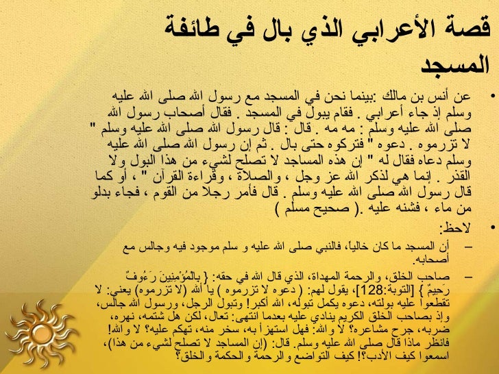 13. 13. ‫قصةلع العرابيلع الذيلع باللع فيلع طائفةلع ‬ ‫المسجد‬ ‫عن أنس بن مالك :بينما نحن في المسجد مع رسول ال صلى ال عليه‬ ‫•‬ ‫وسلم إذ جاء أعرابي . فقا م يبول في المسجد . فقال أصحاب رسول ال‬‫صلى ال عليه وسلم : مه مه . قال : قال رسول ال صلى ال عليه وسلم "‬ ‫ل تزرموه . دعوه " فتركوه حتى بال . ثم إ ن رسول ال صلى ال عليه‬ ‫وسلم دعاه فقال له " إ ن هذه المساجد ل تصلح لشيء من هذا البول ول‬ ‫القذر . إنما هي لذكر ال عز وجل ، والصلة ، وقراءة القرآ ن " ، أو كما‬‫قال رسول ال صلى ال عليه وسلم . قال فأمر رجل من القو م ، فجاء بدلو‬ ‫من ماء ، فشنه عليه .) صحيح مسلم (‬ ‫لحظ:‬ ‫•‬ ‫أ ن المسجد ما كا ن خاليا، فالنبي صلى ال عليه و سلم موجود فيه وجالس مع‬ ‫ ً‬ ‫–‬ ‫أصحابه.‬ ‫نِ َرْ م ُ َرْ نِ نِ َ َ م ُ ٌ‬ ‫صاحب الخلق، والرحمة المهداة، الذي قال ال في حقه: } بالمؤمنين رءوف‬ ‫–‬‫رحيم { ]التوبة:821 [، يقول لهم: ) دعوه ل تزرموه ( يا أل )ل تزرموه( يعني: ل‬ ‫ َ نِ ٌ‬‫تقطعوا عليه بولته، دعوه يكمل تبوله، ال أكبر! وتبول الرجل، ورسول ال جالس،‬ ‫وإذ بصاحب الخلق الكريم ينادي عليه بعدما انتهى: تعال، لكن هل شتمه، نهره،‬ ‫ضربه، جرح مشاعره؟ ل وال: فهل استهزأ به، سخر منه، تهكم عليه؟ ل وال!‬ ‫فانظر ماذا قال صلى ال عليه وسلم. قال: )إ ن المساجد ل تصلح لشيء من هذا(،‬ ‫اسمعوا كيف الدب؟! كيف التواضع والرحمة والحكمة والخلق؟‬