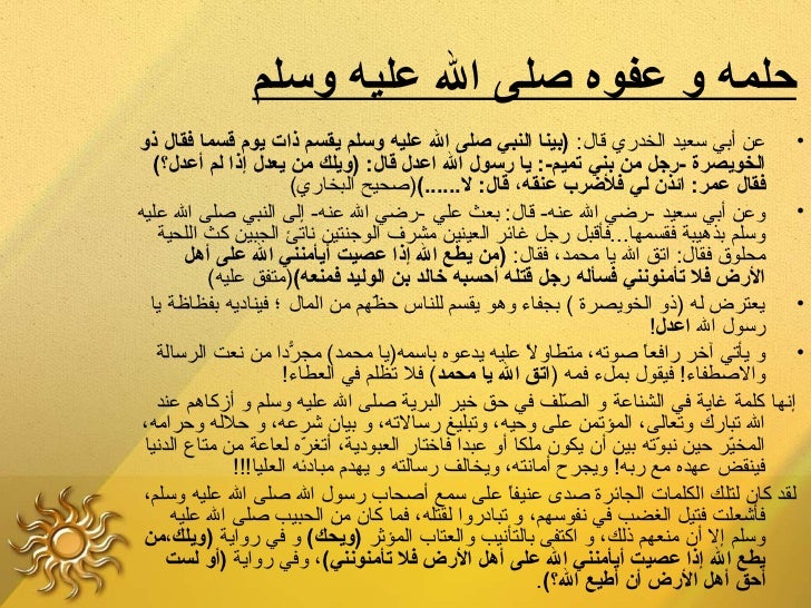 15. 15. ‫حلمهلع ولع عفوهلع صلىلع اللع عليهلع وسلم‬‫• عن أبي سعيد الخدري قال: )بينالع النبيلع صلىلع اللع عليهلع وسلملع يقسملع ذاتلع يوملع قسمالع فقاللع ذولع ‬ ‫الخويصرةلع -رجللع منلع بنيلع تميم-:لع يالع رسوللع اللع اعدللع قال:لع )ويلكلع منلع يعدللع إذالع لملع أعدل!؟(لع ‬ ‫فقاللع عمر:لع ائذنلع ليلع فلضربلع عنقه،لع قال:لع ل......()صحيح البخاري(‬ ‫• وعن أبي سعيد -رضي ال عنه- قال: بعث علي -رضي ال عنه- إلى النبي صلى ال عليه‬ ‫وسلم بذهيبة فقسمها...فأقبل رجل غائر العينين مشرف الوجنتين ناتئ الجبين كث اللحية‬ ‫محلوق فقال: اتق ال يا محمد، فقال: )منلع يطعلع اللع إذالع عصيتلع أيأمننيلع اللع علىلع أهللع ‬ ‫الرضلع فللع تأمنوننيلع فسألهلع رجللع قتلهلع أحسبهلع خالدلع بنلع الوليدلع فمنعه()متفق عليه(‬ ‫• يعترض له )ذو الخويصرة ( بجفاء وهو يقسم للناس حظهم من المال ؛ فيناديه بفظاظة يا‬ ‫ىّ‬ ‫رسول ال اعدل!‬ ‫• و يأتي آخر رافعا صوته، متطاول عليه يدعوه باسمه)يا محمد( مجردا من نعت الرسالة‬ ‫دّ‬ ‫ ً‬ ‫ ً‬ ‫والصطفاء! فيقول بملء فمه )اتقلع اللع يالع محمد( فل تظلم في العطاء!‬ ‫إنها كلمة غاية في الشناعة و الصلف في حق خير البرية صلى ال عليه وسلم و أزكاهم عند‬ ‫ىّ‬ ‫ال تبارك وتعالى، المؤتمن على وحيه، وتبليغ رسالته، و بيا ن شرعه، و حلله وحرامه،‬ ‫المخير حين نبوته بين أ ن يكو ن ملكا أو عبدا فاختار العبودية، أتغره لعاعة من متاع الدنيا‬ ‫ىّ‬ ‫ىّ‬ ‫ىّ‬ ‫فينقض عهده مع ربه! ويجرح أمانته، ويخالف رسالته و يهد م مبادئه العليا!!!‬ ‫لقد كا ن لتلك الكلمات الجائرة صدى عنيفا على سمع أصحاب رسول ال صلى ال عليه وسلم،‬ ‫ ً‬ ‫فأشعلت فتيل الغضب في نفوسهم، و تبادروا لقتله، فما كا ن من الحبيب صلى ال عليه‬ ‫وسلم إل أ ن منعهم ذلك، و اكتفى بالتأنيب والعتاب المؤثر )ويحك( و في رواية )ويلك،منلع ‬ ‫يطعلع اللع إذالع عصيتلع أيأمننيلع اللع علىلع أهللع الرضلع فللع تأمنونني(، وفي رواية )أولع لستلع ‬ ‫أحقلع أهللع الرضلع أنلع أطيعلع ال!؟(.‬