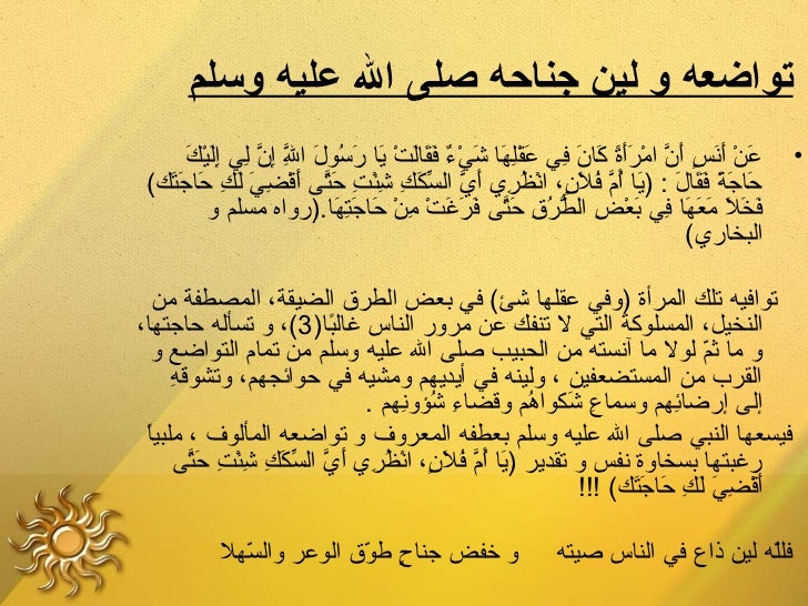 17. 17. ‫تواضعهلع ولع لينلع جناحهلع صلىلع اللع عليهلع وسلم‬ ‫ َ َرْ َ َ ٍ َ َّ َرْ َ َ ً َ َ نِ َ َرْنِ َ َ َرْ ٌ َ َ َ َرْ َ َ م ُ َ َّ نِ َّ نِ نِ َ َرْ َ‬ ‫عن أنس أ ن امرأة كا ن في عقلها شيء فقالت يا رسول ال إ ن لي إليك‬ ‫نِ‬ ‫•‬ ‫حاجة فقال : )يا أ م فل ن، انظري أي السكك شئت حتى أق نِي لك حا َتك(‬ ‫ َ َ ً َ َ َ َ م ُ َّ م ُ َ ٍ َرْ م ُ نِ َ َّ يِّ َ نِ نِ َرْ نِ َ َّ َ َرْض َ َ نِ َ ج َ‬ ‫فخل معها في بعض ال ُّرق حتى فرغت من حاجتها.)رواه مسلم و‬ ‫ َ َ َ َ َ َ نِ َ َرْ نِ ط م ُ نِ َ َّ َ َ َ َرْ نِ َرْ َ َ نِ َ‬ ‫البخاري(‬ ‫توافيه تلك المرأة )وفي عقلها شئ( في بعض الطرق الضيقة، المصطفة من‬‫النخيل، المسلوكة التي ل تنفك عن مرور الناس غالبا)3(، و تسأله حاجتها،‬ ‫ ً‬ ‫و ما ثم لول ما آنسته من الحبيب صلى ال عليه وسلم من تما م التواضع و‬ ‫ىّ‬ ‫نِ‬ ‫القرب من المستضعفين ، ولينه في أيديهم ومشيه في حوائجهم، وتشوقه‬ ‫إلى إرضائهم وسماع شكواهم وقضاء شؤونهم .‬ ‫نِ م ُ نِ‬ ‫نِ َ م ُ‬ ‫نِ‬ ‫ ً‬ ‫فيسعها النبي صلى ال عليه وسلم بعطفه المعروف و تواضعه المألوف ، ملبيا‬ ‫رغبتها بسخاوة نفس و تقدير )يا أ م فل ن، انظري أي السكك شئت حتى‬ ‫ َ م ُ َّ م ُ َ ٍ َرْ م ُ نِ َ َّ يِّ َ نِ نِ َرْ نِ َ َّ‬ ‫أقضي لك حاجتك( !!!‬ ‫ َ َرْ نِ َ َ نِ َ َ َ‬ ‫و خفض جناح طوق الوعر والسهل‬ ‫ىّ‬ ‫ ٍ ىّ‬ ‫فلله لين ذاع في الناس صيته‬ ‫ىّ‬