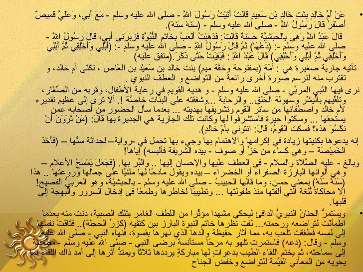 18. 18. ‫• عن أ م خالد بنت خالد بن سعيد قالت أتيت رسول ال - صلى ال عليه وسلم - مع أبي، وعلي قمي ٌ‬ ‫ َ َ َ نِ َ َ َ َّ َ نِ ص‬ ‫نِ‬ ‫ َ َرْ م ُ يِّ َ نِ ٍ نِ َرْ نِ َ نِ نِ َرْ نِ َ نِ ٍ َ َ َرْ َ َ َرْ م ُ َ م ُ َ َّ‬ ‫أصفر قال رسول ال - صلى ال عليه وسلم - )سنه سنه(.‬ ‫ َ َ َرْ َ َ َرْ‬ ‫نِ‬ ‫ َ َرْ َ م ُ َ َ َ م ُ م ُ َّ‬ ‫قال عبد ال وهي بالحبشية حسنة قالت: فذهبت ألعب بخاتم النبوة فزبرني أبي، قال رسول ال -‬ ‫نِ‬ ‫ َ َ َ َرْ م ُ َّ َ نِ َ نِ َرْ َ َ نِ َّ نِ َ َ َ ٌ َ َ َرْ َ َ َ َرْ م ُ َ َرْ َ م ُ نِ َ َ نِ ُّ م ُ َّ نِ َ َ َ نِ َ نِ َ َ َ م ُ م ُ َّ‬ ‫نِ‬ ‫صلى ال عليه وسلم -: )دعها( ثم قال رسول ال - صلى ال عليه وسلم -: )أبلي وأخلقي ثم أبلي‬ ‫ َ َرْنِ َ َ َرْنِ نِ م ُ َّ َ َرْنِ‬ ‫نِ‬ ‫ َ َرْ َ م ُ َّ َ َ َ م ُ م ُ َّ‬ ‫وأخلقي ثم أبلي وأخلقي( قا َ عبد ال : فبقيت حتى ذكر.)متفق عليه(‬ ‫ َ َ َرْنِ نِ م ُ َّ َ َرْنِ َ َ َرْنِ نِ َ ل َ َرْ م ُ َّ َ َ نِ َ َرْ َ َّ َ َ َ‬ ‫نِ‬ ‫تأتيه جارية صغيرة هي : أمة )بمفتوحة وخفة ميم( بنت خالد بن سعيد بن العاص ، تكنى أ م خالد، و‬ ‫ىّ‬ ‫ َ نِ‬ ‫ َ َرْ‬ ‫َّ‬ ‫ َ‬ ‫تقترب منه لترسم صورة أخرى رائعة من التواضع و العطف النبوي .‬ ‫نرى فيها النبي المربي - صلى ال عليه وسلم - و هديه القويم في رعاية الطفال، وقربه من الصغار،‬ ‫يِّ َ‬ ‫يِّ‬ ‫َّ‬ ‫وتلقيهم بالبشر وسهولة الخلق.. والرحابة ...وشفقته على البنات خاصة !. أل ترى إلى عظيم تقديره‬ ‫َّ‬ ‫نِ َرْ‬ ‫يِّ‬ ‫ل م خالد واصطفائها من سائر القو م وتشريفها بهديته ... بعدما سأل الحضور من أصحابه عمن‬ ‫ َ َ َ َرْ َ َ َ َ َ َرْ‬ ‫يستحقها ... وسكتوا حيرة فاستشرفوا لها وكانت تلك الجارية هي الجديرة بها قال: )من ترو ن أ ن‬ ‫نكسو هذه؟ فسكت القو م، قال: ائتوني بأ م خالد(.‬ ‫ىّ ٍ‬ ‫م ُ َ َ‬ ‫َرْ م ُ َ‬ ‫ َ َ َ َ‬ ‫إنه يدعوها بكنيتها زيادة في إكرامها والهتما م بها وجيء بها تحمل في -رواية– لحداثة سنها – )فأخذ‬ ‫يِّ‬ ‫الخميصة – وهي كساء من خز أو صوف - بيده الشريفة فألبسه( إياها!‬ ‫ٍّ‬ ‫ َ نِ َرْ َ َ‬ ‫وبالغ - عليه الصلة والسل م - في العطف عليها والحسا ن إليها .. والبر بها. )فجعل يمسح العل م –‬ ‫ َ َ َ َ َ َرْ َ م ُ‬ ‫يِّ‬ ‫َّ‬ ‫وهي ألوانها البارزة الصفراء أو الخضراء – بيده ويقول مادحا لها مثنيا على جمالها وروعتها .. هذا‬ ‫ ً‬ ‫ ً‬ ‫)سنه سنه( بمعنى حسن، وما قالها الحبيب - صلى ال عليه وسلم - بالحبشية، وهو العربي الفصيح!‬ ‫ُّ‬ ‫َّ‬ ‫م ُ‬ ‫ َ َ َرْ َ َ َرْ‬ ‫إل محاكاة للغة التي ألفتها منذ طفولتها ... وتطييبا لخاطرها وطمعا في إدخال السرور والبهجة إلى‬ ‫ ً‬ ‫ ً‬ ‫ُّ‬ ‫قلبها.‬ ‫• ويستمر الحنا ن النبوي الدافئ ليحكي مشهدا مؤثرا من اللطف الغامر بتلك الصبية، دنت منه بعدما‬ ‫يِّ‬ ‫ُّ‬ ‫م ُ‬ ‫ َ َرْ ُّ‬ ‫اطمأنت لتواضعه ورحمته... لفت نظرها خاتم النبوة البارز بين كتفيه )كزر الحجلة(.. فتاقت نفسها‬ ‫ َ َ َ َرْ م ُ‬ ‫يِّ‬ ‫ىّ‬ ‫إلى لمسه فطفقت تلعب به، مما أثار حفيظة والدها الذي نهرها بقسوة، فنهاه النبي - صلى ال عليه‬ ‫وسلم - وقال: )دعه( فاستمرت تلهو به مرحا مستأنسة برضى النبي - صلى ال عليه وسلم - مطمئنة‬ ‫ ً‬‫إلى سماحته، ثم يختم اللقاء الطيب بدعوات لها مباركة يرددها ثلثا ويمتد أثرها إلى أمد ذاك اللقاء بما‬ ‫ُّ‬ ‫ ً‬ ‫ ٍ‬ ‫ ٍ‬ ‫يحويه من المعاني القيمة للتواضع وخفض الجناح‬ ‫يِّ‬