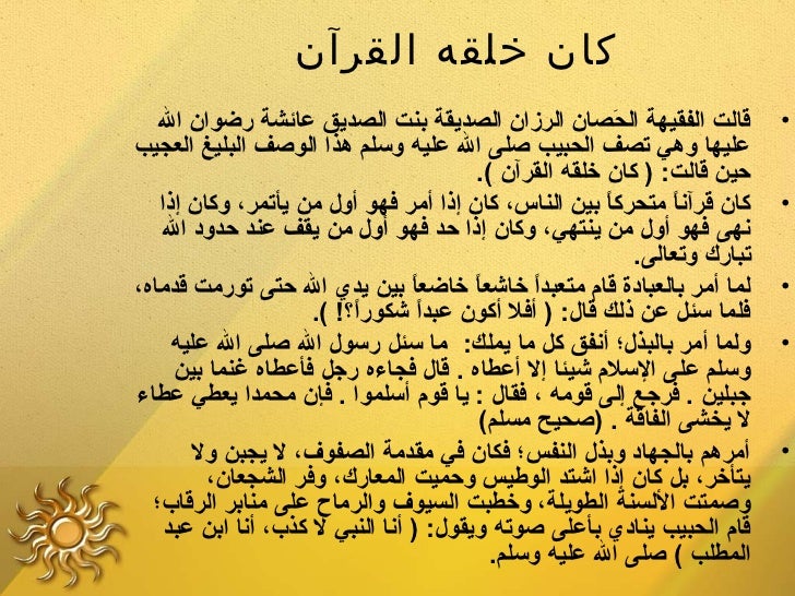 2. 2. ‫كان خلقه القرآن‬ ‫قالتلع الفقيهةلع الحصانلع الرزانلع الصديقةلع بنتلع الصديقلع عائشةلع رضوانلع اللع ‬ ‫صَ‬ ‫•‬‫عليهالع وهيلع تصفلع الحبيبلع صلىلع اللع عليهلع وسلملع هذالع الوصفلع البليغلع العجيبلع ‬ ‫حينلع قالت:لع )لع كانلع خلقهلع القرآنلع (.‬ ‫كانلع قرآنالع متحركالع بينلع الناس،لع كانلع إذالع أمرلع فهولع أوللع منلع يأتمر،لع وكانلع إذالع ‬ ‫ ً‬ ‫ ً‬ ‫•‬ ‫نهىلع فهولع أوللع منلع ينتهي،لع وكانلع إذالع حدلع فهولع أوللع منلع يقفلع عندلع حدودلع اللع ‬ ‫تباركلع وتعالى.‬‫لمالع أمرلع بالعبادةلع قاملع متعبدالع خاشعالع خاضعالع بينلع يديلع اللع حتىلع تورمتلع قدماه،لع ‬ ‫ ً‬ ‫ ً‬ ‫ ً‬ ‫•‬ ‫فلمالع سئللع عنلع ذلكلع قال:لع )لع أفللع أكونلع عبدالع شكورا!؟!لع (.‬ ‫ ً‬ ‫ ً‬ ‫ولمالع أمرلع بالبذل؛لع أنفقلع كللع مالع يملك:لع لع مالع سئللع رسوللع اللع صلىلع اللع عليهلع ‬ ‫•‬ ‫وسلملع علىلع السلملع شيئالع إللع أعطاهلع .لع قاللع فجاءهلع رجللع فأعطاهلع غنمالع بينلع ‬ ‫جبلينلع .لع فرجعلع إلىلع قومهلع ،لع فقاللع :لع يالع قوملع أسلموالع .لع فإنلع محمدالع يعطيلع عطاءلع ‬ ‫للع يخشىلع الفاقةلع .لع )صحيحلع مسلم(لع ‬ ‫أمرهملع بالجهادلع وبذللع النفس؛لع فكانلع فيلع مقدمةلع الصفوف،لع للع يجبنلع وللع ‬ ‫•‬ ‫يتأخر،لع بللع كانلع إذالع اشتدلع الوطيسلع وحميتلع المعارك،لع وفرلع الشجعان،لع ‬ ‫وصمتتلع اللسنةلع الطويلة،لع وخطبتلع السيوفلع والرماحلع علىلع منابرلع الرقاب؛لع ‬ ‫قاملع الحبيبلع يناديلع بأعلىلع صوتهلع ويقول:لع )لع أنالع النبيلع للع كذب،لع أنالع ابنلع عبدلع ‬ ‫المطلبلع (لع صلىلع اللع عليهلع وسلم.‬