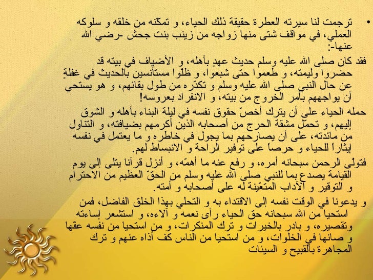 19. 19. ‫عفتهلع ولع حياؤهلع صلىلع اللع عليهلع وسلم‬ ‫تّ‬ ‫عن سالم بن عبد ال عن أبيه أ ن رسول ال صلى ال عليه وسلم مر على رجل من‬ ‫ىّ‬ ‫•‬ ‫النصار وهو يعظ أخاه في الحياء فقال رسول ال صلى ال عليه وسلم :)دعهلع فإنلع الحياءلع ‬ ‫تّ‬ ‫منلع اليمان(.)البخاري و مسلم(‬ ‫عن أنس قال: )لما تزوج النبي صلى ال عليه وسلم زينب أهدت له أ م سليم حيسا في تور‬ ‫•‬ ‫من حجارة فقال أنس فقال رسول ال صلى ال عليه وسلم اذهب فادع لي من لقيت من‬ ‫المسلمين فدعوت له من لقيت فجعلوا يدخلو ن عليه فيأكلو ن ويخرجو ن ووضع النبي صلى‬ ‫ال عليه وسلم يده على الطعا م فدعا فيه وقال فيه ما شاء ال أ ن يقول ولم أدع أحدا لقيته‬ ‫إل دعوته فأكلوا حتى شبعوا وخرجوا وبقي طائفة منهم فأطالوا عليه الحديث فجعل النبي‬ ‫صلى ال عليه وسلم يستحيي منهم أ ن يقول لهم شيئا فخرج وتركهم في البيت فأنزل ال‬ ‫عز وجل: )يالع أيهالع الذينلع آمنوالع للع تدخلوالع بيوتلع النبيلع إ تَّلع أنلع يؤذنلع لكملع إلىلع طعاملع غيرلع ‬ ‫صَ ب ْ ْمُْمُ ْمُ ْمُ صَ تَّ ِ ِّ ِل صَ ب ْ ْمُ ب ْ صَ صَ صَ ْمُ ب ْ ِ صَ صَ صَ )(ٍ صَ ب ْ صَ‬ ‫صَ صَ هُّ صَ تَّ ِ صَ صَ ْمُ‬‫ناظرينلع إناه(، قال قتادة: غير متحينين طعاما، )ولكنلع إذالع دعيتملع فادخلوا(، حتى بلغ: )ذلكملع ‬ ‫صَ ِ ْمُ ب ْ‬ ‫صَ صَ ِ ب ْ ِ صَ ْمُ ِ ْمُ ب ْ صَ ب ْ ْمُْمُ‬ ‫صَ ِ ِ صَ ِ صَ ْمُ‬ ‫أطهرلع لقلوبكملع وقلوبهن((.)مسلم(‬ ‫صَ ب ْ صَ ْمُ ِ ْمُْمُ ِ ْمُ ب ْ صَ ْمُ ْمُ ِ ِ تَّ‬ ‫عن أبي سعيد الخدري -رضي ال عنه- قال: )كانلع النبيلع صلىلع اللع عليهلع وسلملع أشدلع حياءلع ‬ ‫•‬ ‫منلع العذراءلع فيلع خدرهالع حدثنيلع محمدلع بنلع بشارلع حدثنالع يحيىلع وبنلع مهديلع قال:لع حدثنالع شعبةلع ‬ ‫مثلهلع وإذالع كرهلع شيئالع عرفلع فيلع وجهه(.)متفق عليه(‬