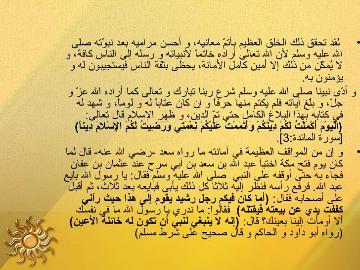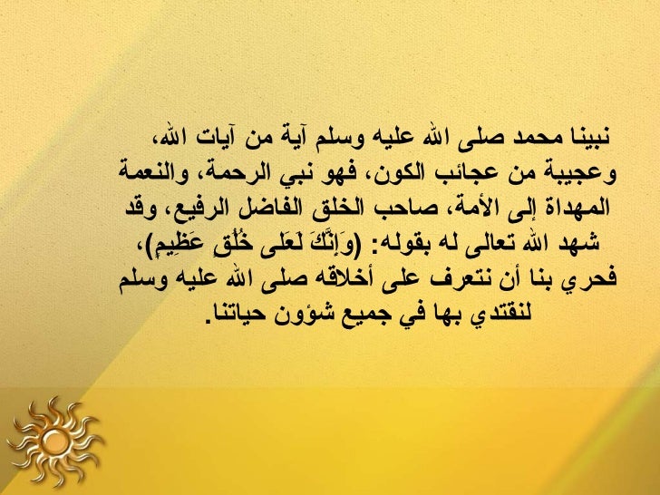 26. 26. ‫نبينالع محمدلع صلىلع اللع عليهلع وسلملع آيةلع منلع آياتلع ال،لع ‬‫وعجيبةلع منلع عجائبلع الكون،لع فهولع نبيلع الرحمة،لع والنعمةلع ‬ ‫المهداةلع إلىلع المة،لع صاحبلع الخلقلع الفاضللع الرفيع،لع وقدلع ‬ ‫شهدلع اللع تعالىلع لهلع بقوله:لع )وإنكلع لعلىلع خلقلع عظيم(،لع ‬ ‫صَ ِ تَّ صَ صَ صَ ْمُْمُ )(ٍ صَ ِ )(ٍ‬‫فحريلع بنالع أنلع نتعرفلع علىلع أخلقهلع صلىلع اللع عليهلع وسلملع ‬ ‫لنقتديلع بهالع فيلع جميعلع شؤونلع حياتنا.‬