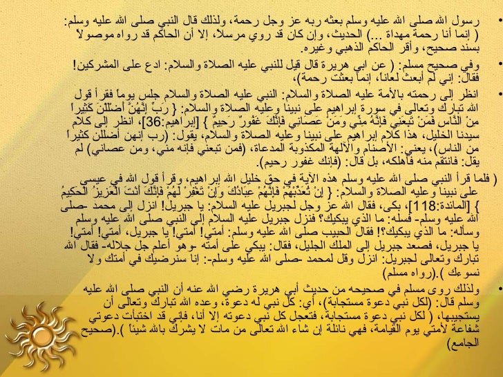 25. 25. ‫• رسول ال صلى ال عليه وسلم بعثه ربه عز وجل رحمة، ولذلك قال النبي صلى ال عليه وسلم:‬ ‫ ً‬ ‫) إنما أنا رحمة مهداة ...( الحديث، وإ ن كا ن قد روي مرسل، إل أ ن الحاكم قد رواه موصول‬ ‫ ً‬ ‫بسند صحيح، وأقر الحاكم الذهبي وغيره.‬ ‫• وفي صحيح مسلم: ) عن ابي هريرة قال قيل للنبي عليه الصلة والسل م: ادع على المشركين!‬ ‫فقال: إني لم أبعث لعانا، إنما بعثت رحمة(،‬ ‫ ً‬ ‫• انظر إلى رحمته بالمة عليه الصلة والسل م: النبي عليه الصلة والسل م جلس يوما فقرأ قول‬ ‫ ً‬ ‫ َ يِّ نِ َّ م ُ َّ َ َ َرْ َ َ نِ ً‬ ‫ال تبارك وتعالى في سورة إبراهيم على نبينا وعليه الصلة والسل م: } رب إنهن أضَرْللن كثيرا‬ ‫من الناس فمن تبعني فإنه مني ومن عصاني فإنك غفور رحيم { ]إبراهيم:63[، انظر إلى كل م‬ ‫نِ َرْ َّ نِ َ َ َرْ َ نِ َ نِ َنَِّ م ُ نِ يِّ َ َ َرْ َ َ نِ َنِ َّ َ َ م ُ ٌ َ نِ ٌ‬ ‫ ً‬ ‫سيدنا الخليل، هذا كل م إبراهيم على نبينا وعليه الصلة والسل م، يقول: )رب إنهن أضللن كثيرا‬ ‫من الناس(، يعني: الصنا م واللهة المكذوبة المدعاة، )فمن تبعني فإنه مني، ومن عصاني( لم‬ ‫يقل: فانتقم منه فأهلكه، بل قال: )فإنك غفور رحيم(.‬ ‫) فلما قرأ النبي صلى ال عليه وسلم هذه الية في حق خليل ال إبراهيم، وقرأ قول ال في عيسى‬‫نِ َرْ م ُ َ يِّ َرْ م ُ َرْ َنَِّ م ُ َرْ نِ َ م ُ َ َنِ َرْ َ َرْ نِ َرْ َ م ُ َرْ َنَِّ َ َ َرْ َ َرْ َ نِ م ُ َرْ َ نِ م ُ‬‫على نبينا وعليه الصلة والسل م: } إ ن تعذبهم فإنهم عبادك وإ ن تغفر لهم فإنك أنت العزيز الحكيم‬‫{ ]المائدة:811 [، بكى، فقال ال عز وجل لجبريل عليه السل م: يا جبريل! انزل إلى محمد -صلى‬ ‫ال عليه وسلم- فسله: ما الذي يبكيك؟ فنزل جبريل عليه السل م إلى النبي صلى ال عليه وسلم‬ ‫وسأله: ما الذي يبكيك؟! فقال الحبيب صلى ال عليه وسلم: أمتي! أمتي! يا جبريل، أمتي! أمتي!‬ ‫يا جبريل، فصعد جبريل إلى الملك الجليل، فقال: يبكي على أمته -وهو أعلم جل جلله- فقال ال‬ ‫تبارك وتعالى لجبريل: انزل وقل لمحمد -صلى ال عليه وسلم-: إنا سنرضيك في أمتك ول‬ ‫نسوءك (.)رواه مسلم(‬ ‫• ولذلك روى مسلم في صحيحه من حديث أبي هريرة رضي ال عنه أ ن النبي صلى ال عليه‬ ‫وسلم قال: )لكل نبي دعوة مستجابة(، أي: كل نبي له دعوة، وعده ال تبارك وتعالى أ ن‬ ‫يستجيبها، ) لكل نبي دعوة مستجابة، فتعجل كل نبي دعوته إل أنا، فإني قد اختبأت دعوتي‬ ‫شفاعة لمتي يو م القيامة، فهي نائلة إ ن شاء ال تعالى من مات ل يشرك بال شيئا (.)صحيح‬ ‫ ً‬ ‫الجامع(‬