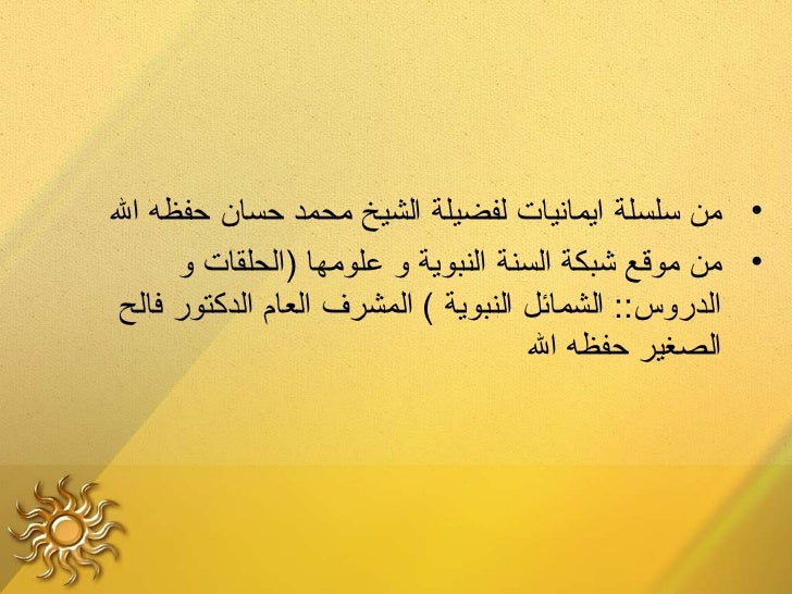 27. 27. ‫• من سلسلة ايمانيات لفضيلة الشيخ محمد حسا ن حفظه ال‬ ‫• من موقع شبكة السنة النبوية و علومها )الحلقات و‬‫الدروس:: الشمائل النبوية ( المشرف العا م الدكتور فالح‬ ‫الصغير حفظه ال‬