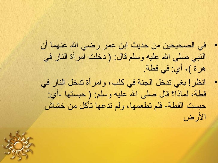 5. 5. ‫• في الصحيحين من حديث ابن عمر رضي ال عنهما أ ن‬ ‫النبي صلى ال عليه وسلم قال: ) دخلت امرأة النار في‬ ‫هرة (، أي: في قطة.‬‫• انظر! بغي تدخل الجنة في كلب، وامرأة تدخل النار في‬ ‫قطة، لماذا؟ قال صلى ال عليه وسلم: ) حبستها -أي:‬ ‫حبست القطة- فلم تطعمها، ولم تدعها تأكل من خشاش‬ ‫الرض‬