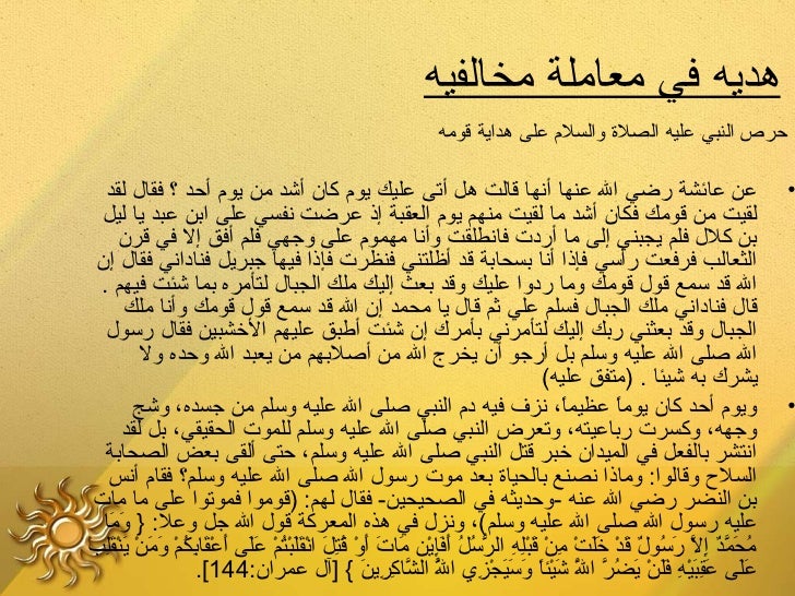 6. 6. ‫هديه في معاملة مخالفيه‬ ‫حرص النبي عليه الصلة والسل م على هداية قومه‬ ‫عن عائشة رضي ال عنها أنها قالت هل أتى عليك يو م كا ن أشد من يو م أحد ؟ فقال لقد‬ ‫•‬ ‫لقيت من قومك فكا ن أشد ما لقيت منهم يو م العقبة إذ عرضت نفسي على ابن عبد يا ليل‬ ‫بن كلل فلم يجبني إلى ما أردت فانطلقت وأنا مهمو م على وجهي فلم أفق إل في قر ن‬ ‫الثعالب فرفعت رأسي فإذا أنا بسحابة قد أظلتني فنظرت فإذا فيها جبريل فناداني فقال إ ن‬ ‫ال قد سمع قول قومك وما ردوا عليك وقد بعث إليك ملك الجبال لتأمره بما شئت فيهم .‬ ‫قال فناداني ملك الجبال فسلم علي ثم قال يا محمد إ ن ال قد سمع قول قومك وأنا ملك‬ ‫الجبال وقد بعثني ربك إليك لتأمرني بأمرك إ ن شئت أطبق عليهم الخشبين فقال رسول‬ ‫ال صلى ال عليه وسلم بل أرجو أ ن يخرج ال من أصلبهم من يعبد ال وحده ول‬ ‫يشرك به شيئا . )متفق عليه(‬ ‫ويو م أحد كا ن يوما عظيما، نزف فيه د م النبي صلى ال عليه وسلم من جسده، وشج‬ ‫ ً‬ ‫ ً‬ ‫•‬ ‫وجهه، وكسرت رباعيته، وتعرض النبي صلى ال عليه وسلم للموت الحقيقي، بل لقد‬ ‫انتشر بالفعل في الميدا ن خبر قتل النبي صلى ال عليه وسلم، حتى ألقى بعض الصحابة‬ ‫السلح وقالوا: وماذا نصنع بالحياة بعد موت رسول ال صلى ال عليه وسلم؟ فقا م أنس‬ ‫بن النضر رضي ال عنه -وحديثه في الصحيحين- فقال لهم: )قوموا فموتوا على ما مات‬ ‫عليه رسول ال صلى ال عليه وسلم(، ونزل في هذه المعركة قول ال جل وعل: } وما‬ ‫ َ َ‬‫محمد إل رسول قد خلت نِن قبله الرسل أفإين مات أو قتل انقلبتم على أعقابكم ومن ينقلبَرْ‬ ‫م ُ َ َّ ٌ نِ َّ َ م ُ ٌ َ َرْ َ َ َرْ م َرْ َ َرْنِ نِ ُّ م ُ م ُ َ َنِ َرْ َ َ َ َرْ م ُ نِ َ َرْ َ َ َرْ م ُ َرْ َ َ َ َرْ َ نِ م ُ َرْ َ َ َرْ َ َرْ َنِ‬ ‫على عقبيه فلن يضر ال شيئا وسيجزي ال الشاكرين { ]آل عمرا ن:441[.‬ ‫َّ َّ نِ نِ َ‬ ‫م ُ‬ ‫ َ َ َ نِ َ َرْ نِ َ َ َرْ َ م ُ َّ َّ َ َرْ ً َ َ َ َرْ نِ‬ ‫ َ‬